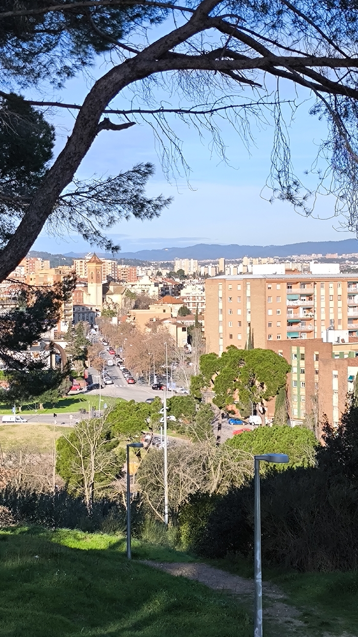 The image depicts an elevated panoramic view of the city of Cerdanyola del Vallès, Spain, under a clear blue sky during daylight hours. The vantage point appears to be a park or green space, with dark pine branches framing the top and upper-left of the scene. In the immediate foreground, a dirt path winds upwards through a grassy slope. Two modern, grey cylindrical streetlights with flat tops are positioned along this path, one in the lower center and another further up to the left. Sunlight casts shadows across the grass. The midground features a dense urban landscape. A primary road, lined with numerous parked vehicles including cars, SUVs, and a white van, extends horizontally across the frame and into the distance. Many deciduous trees along this road are bare, indicating late autumn or winter. Prominently situated on the left side of the midground is a church-like building, identified as the Església Parroquial de Sant Martí, characterized by its light-colored facade and a distinct reddish-brown bell tower with a spire. Surrounding the church and the road are various multi-story residential and commercial buildings, predominantly in terracotta, beige, and light brown hues, some featuring balconies. Evergreen trees are interspersed throughout the urban area. The background shows further urban development extending towards a range of distant hills or mountains on the horizon. No individuals or specific interactions are discernible within the frame.