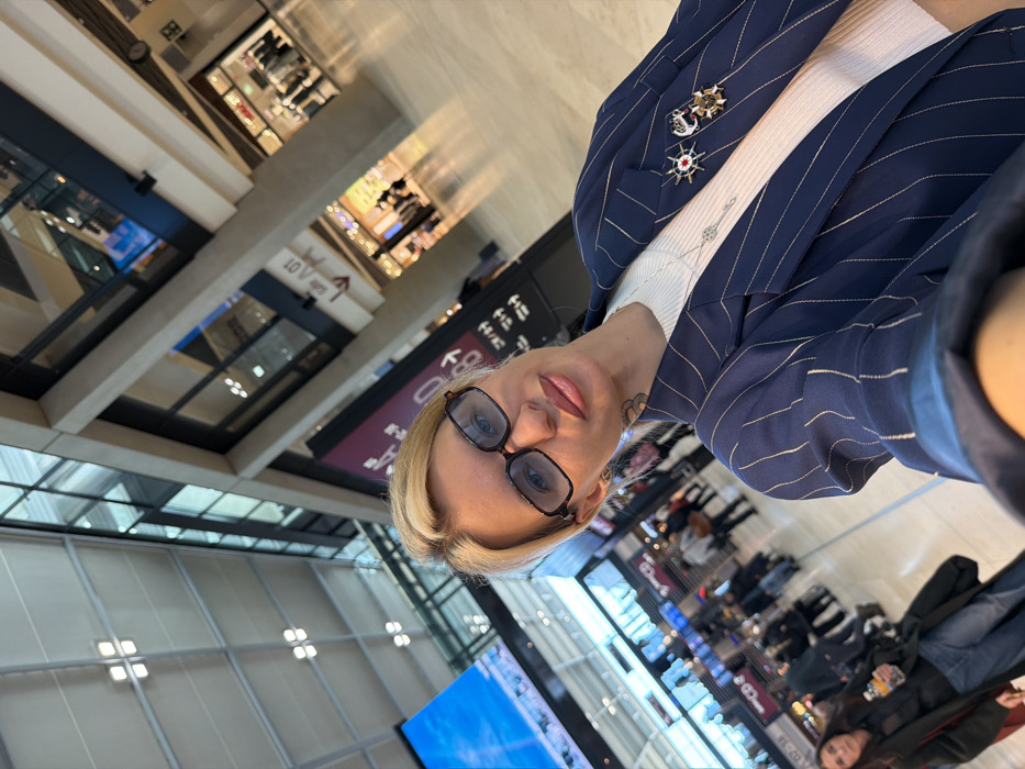 The scene is located within Berlin Brandenburg Airport (BER) in Schönefeld, Germany. In the foreground, a female individual with blonde hair, wearing dark-rimmed glasses, faces the camera directly. She has light pink lipstick applied and a small, dark spiral tattoo on the left side of her neck below the ear. She is dressed in a dark blue pinstriped blazer over a white ribbed top. A silver-toned necklace with a key-shaped pendant is visible. On her left blazer lapel, two distinct brooches are pinned: a circular, red and white one with spoke-like elements, and an abstract black, white, and gold figure depicting a stylized animal or character. Her right arm and hand, holding the camera device, are partially visible at the bottom right. The background reveals a bustling, multi-level airport terminal with modern architecture, including exposed metallic ceiling framework, square light fixtures, concrete columns and beams, and large glass panels. To the left of the main subject, a segment of a large digital display shows a blue sky with clouds. Further back on the left, numerous blurred individuals are seen moving through the concourse, some with luggage. A woman in the lower-left is partially visible, wearing a dark coat and blue jeans, holding a small bottle with an orange label and a lit cigarette. To the right of the main subject, multiple retail storefronts are discernible on different levels. Signage, including a portion resembling 'H&M,' is present. A prominent sign with a downward arrow reads 'S1 A 01,' with additional characters 'H/H' or similar below it. The flooring throughout the public area is a light-colored, polished material. The environment is well-illuminated by artificial lighting.