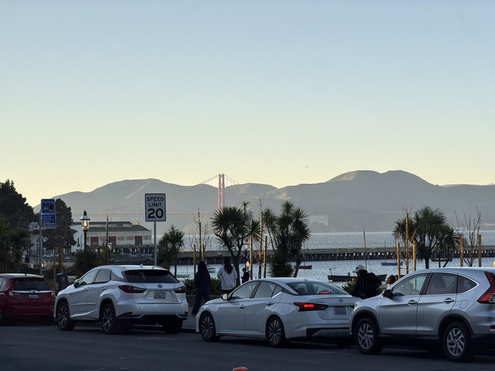 A row of parked cars lines a street with a waterfront view. A white Lexus SUV and a silver Honda CR-V are among the vehicles. People stand near the waterfront, partially obscured by trees. In the distance, the Golden Gate Bridge is visible through the haze, framed by mountains. A speed limit sign reads "20." Boats dot the water. The overall scene is bathed in soft, muted light.