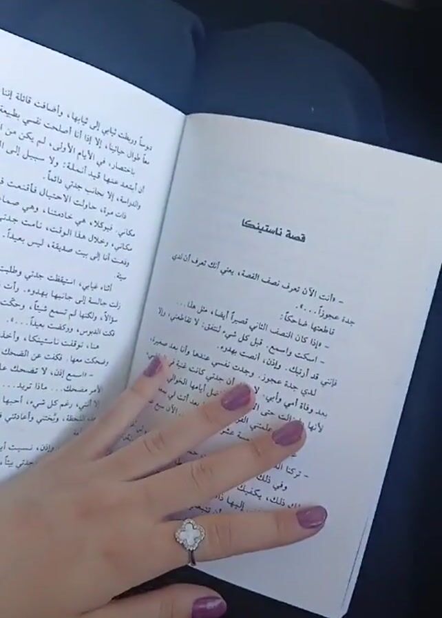 A woman is seen reading a book in an unknown vehicle. She holds the book open with her right hand, which has purple nail polish and a silver ring with a white clover design. The book is titled "The White Nights" by Dostoevsky in Arabic. The camera focuses on the book and then shifts to show the cover, which has a portrait of Dostoevsky and an image of a starry night. The interior of the vehicle is visible, with a dark seat and a blurry background. The video is shot from a slightly elevated angle.