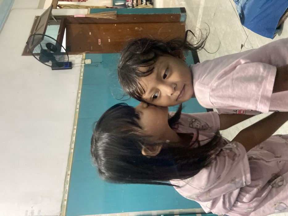 Two young girls are posing closely together indoors. One girl, wearing a pink shirt, is looking at the camera with a slight smile. The other girl, also in pink pajamas with cartoon designs, is leaning towards the first girl, seemingly whispering into her ear. Behind them is a blue wall with a window and a fan visible on the left. Part of a wooden cabinet is also in the background. The overall composition is slightly rotated.