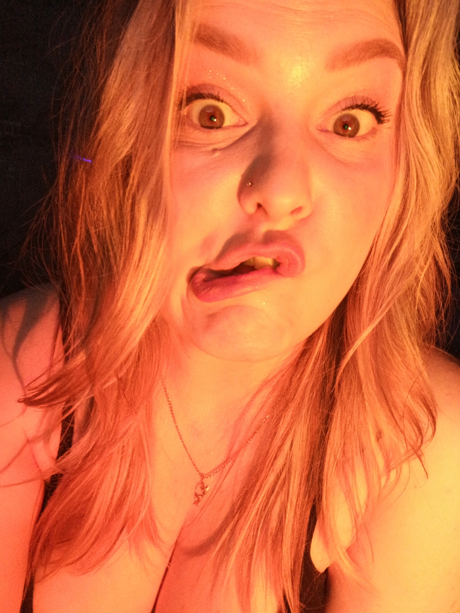 A selfie of a young woman with pale skin, light hair, and brown eyes, making a distorted facial expression