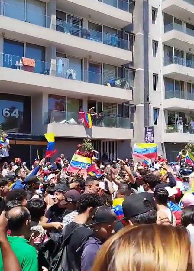 large crowd of people gathered on a city street. They are waving flags with the colors yellow, blue, and red, presumably the flag of Venezuela. The crowd is densely packed, and people are wearing various clothing, including hats, t-shirts, and jackets. The video appears to be taken from within the crowd, looking towards a tall, modern building with multiple floors and balconies. Some people are visible on the balconies, also waving flags. The atmosphere seems festive and energetic. The lighting indicates it is daytime. A tree is visible on the street to the right. The building has the number "64" visible above the entrance. A speaker system is also visible in the middle of the crowd.