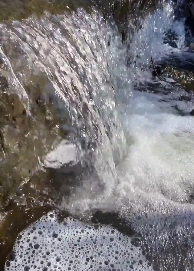 water cascading over a small, rocky waterfall. The water is clear and bubbly, with a large amount of foam accumulating at the base of the fall. The surrounding rocks are dark and wet, with some moss growth visible. The scene is well-lit, with sunlight reflecting off the flowing water.