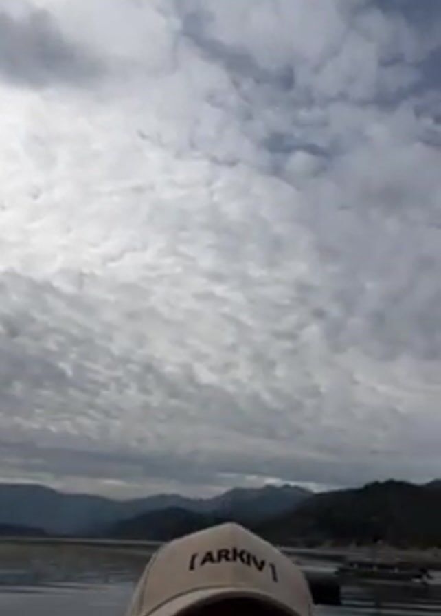 A woman stands in front of a body of water. She is wearing a baseball cap that says [ARKIV]. Behind her, a boat sits on the still water which is surrounded by mud flats, and there are mountains in the distance. The sky is overcast. The camera moves slightly throughout the short video.