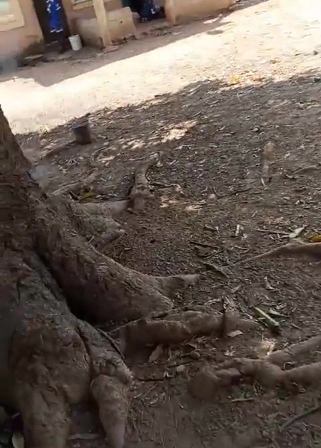 dusty, sun-drenched courtyard in front of a light-colored building. The foreground is a ground littered with tree roots, twigs, and dried leaves. The building has a porch supported by arched columns. People are sitting on the porch. A person in a blue shirt walks in front of the building carrying a white container. In the background, a few other buildings can be seen.
