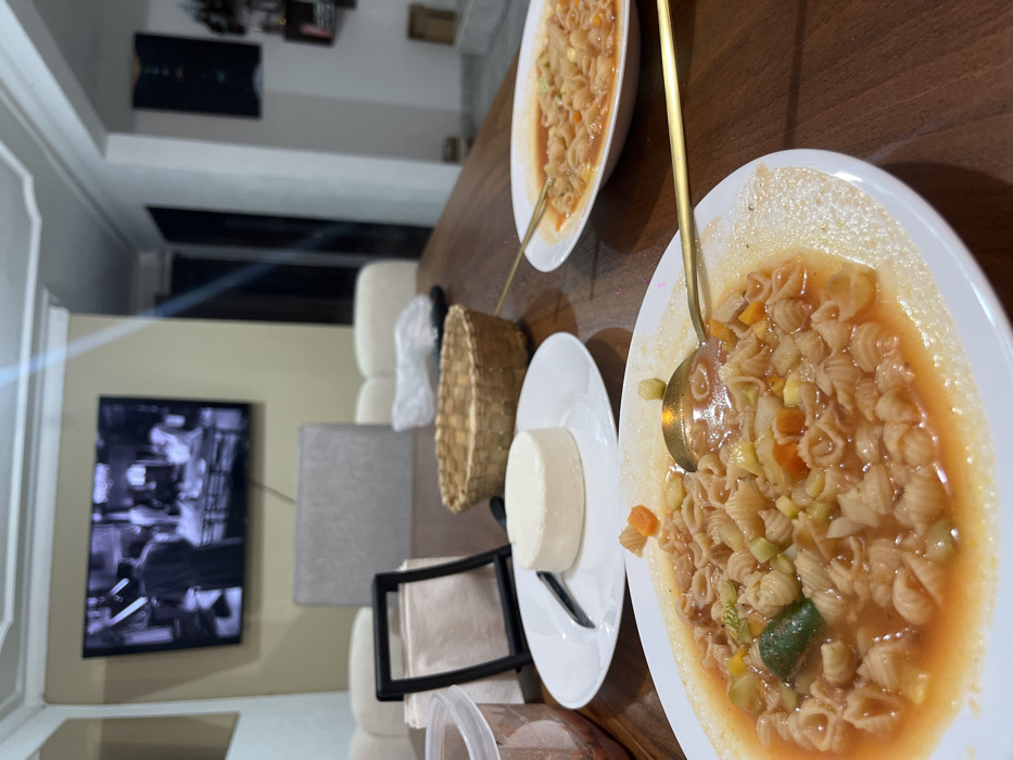 Two bowls of pasta soup sit on a wooden table, one partially obscured. A gold ladle rests in the closer bowl. A small white plate holds a cylinder of white food, possibly cheese, alongside a knife. A woven basket is visible. The background features a TV on a wall, a cream-colored sofa, and a gray chair.
