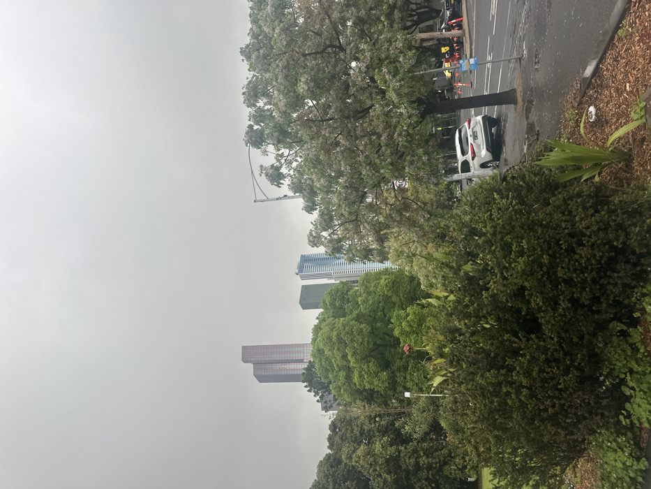 The image depicts an urban landscape under an overcast, light grey sky, with visibly wet street surfaces indicative of recent precipitation. No human figures are present. In the foreground, dense green foliage, including a large, dark green shrub, occupies the lower center and left. Various smaller plants and ground cover are visible around the shrub's base. A solitary pink-red flower is discernible amidst a cluster of green trees further back on the left. The midground features a wet, paved road with visible lane markings. A white SUV, identified as a Hyundai Kona, is parked facing away from the viewer on the right side of the road, partially obscured by a tree. A '40' speed limit sign is attached to a pole behind the parked vehicle. A street light assembly extends over the roadway from the right. Orange traffic cones and road barriers are visible further down the street on the right. The background reveals a cluster of high-rise buildings comprising the Melbourne Central Business District skyline, rising above the extensive tree canopy. Prominent among these structures is a distinctive twin-towered building with a reddish-brown facade (Eureka Tower), along with several other modern glass and concrete skyscrapers. The scene is situated in Carlton, Australia, with the perspective suggesting a view looking south towards the Melbourne CBD.