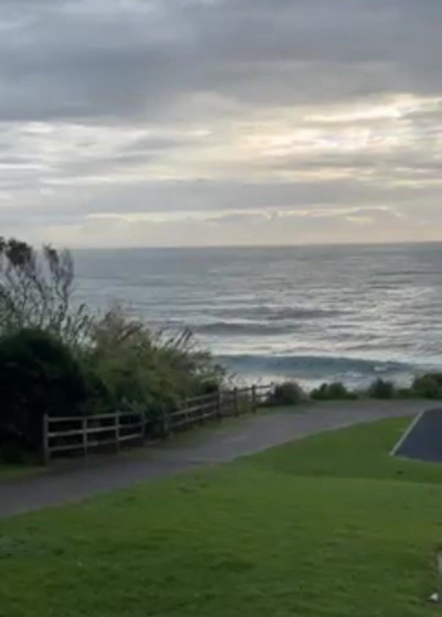 The video depicts a coastal scene on an overcast day