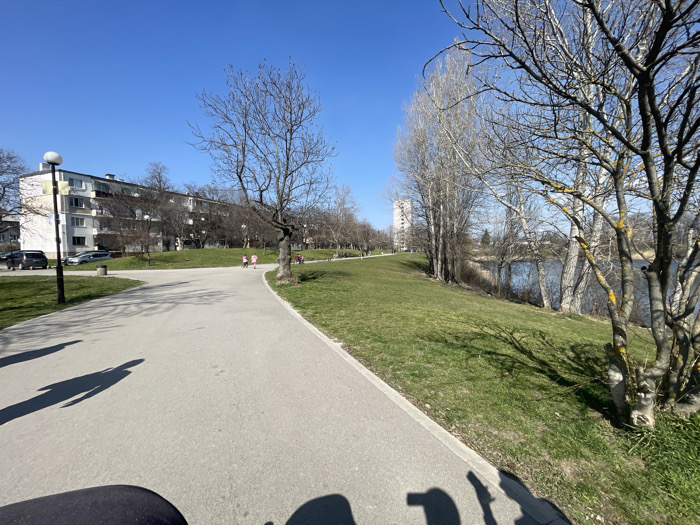The scene depicts a sunny, late winter or early spring day in Druzhba Park, Sofia, Bulgaria, adjacent to Lake Druzhba. A wide, light-grey paved pathway, bordered by a darker curb on its right, curves from the lower left toward the upper center. Multiple long, dark shadows, including those of the photographer and at least two other individuals, are cast across the pathway from the lower left. To the left of the path, a grassy area features a tall, dark streetlamp with a circular white fixture and several bare deciduous trees. Further along the path in the midground, two small figures, possibly children, dressed in pink, are visible running or walking. To the right of the pathway, a grassy bank slopes down towards a body of water. This bank is lined with numerous tall, slender, bare deciduous trees, some of which exhibit patches of yellow lichen on their branches. The background on the left reveals a long, four to five-story residential apartment building, predominantly white and light grey, with numerous windows and balconies. Several dark-colored cars are parked on an adjacent street or lot near this building. In the distant center-background, another taller, slender building is partially visible amongst trees. The large body of water, identified as Lake Druzhba, is calm and partially reflects the clear, cloudless blue sky, extending into the right background.