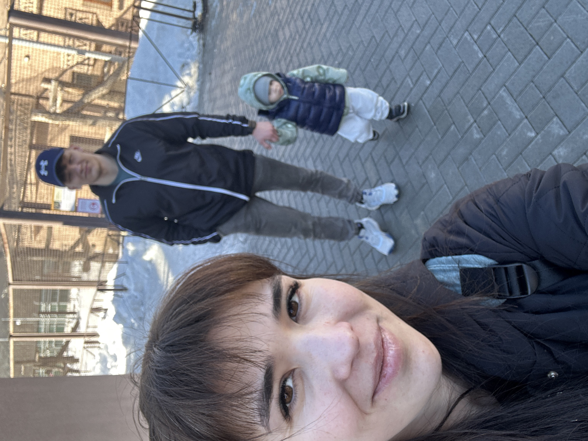 The image displays three individuals in a selfie-style photograph taken at the Perm Zoo (Пермский зоопарк) in Perm, Russia, under bright daylight during a period of snow cover. In the immediate foreground, a female adult with long dark hair and bangs smiles directly into the camera. She wears a dark jacket, with a light blue strap of a backpack visible over her right shoulder. Behind her, an adult male stands to the center-right, wearing a dark blue baseball cap with a light-colored logo, a black track jacket with white stripes on the sleeves, a light green shirt, dark grey pants, and white athletic shoes. He holds the right hand of a toddler positioned to his right. The toddler is dressed in a grey knitted beanie, a light green hooded top, a dark blue quilted vest, light-colored pants, and dark shoes. All three are standing on a pathway paved with grey rectangular interlocking pavers arranged in a herringbone pattern. In the background, beyond a snow-covered embankment, several large outdoor animal enclosures constructed with metal mesh fencing and internal wooden structures are visible. A light brown building wall is present on the far left of the frame.