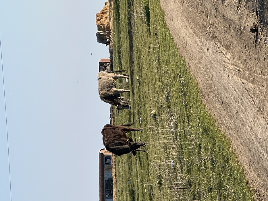 The scene depicts an open, semi-rural landscape located on the periphery of Burgas, Bulgaria, under a clear daylight sky. In the foreground, a dirt track with distinct tire tread impressions traverses diagonally from the bottom right towards the center left. Adjacent to the track, a grassy area exhibits sparse, dry vegetation and scattered litter, including white plastic fragments and what appear to be discarded vegetable remains. Three bovine subjects are present in the midground, engaged in grazing. From left to right: a dark brown cow with small horns, its head lowered to the grass; a light grey/tan cow, also with small horns and grazing; and a third grey/tan cow, partially obscured by a large, mounded pile of hay or straw, similarly positioned with its head down. Additional debris is visible within the grass surrounding the grazing animals. The background features several structures under a pale blue sky. To the left, a long, low, weathered, and possibly rusted metal structure, resembling a modified shipping container or a dilapidated building. To the right, a smaller, reddish-brown rectangular structure is visible. A faint overhead power line is discernible across the upper portion of the sky, with several small specks indicative of birds. No human figures are present in the image.
