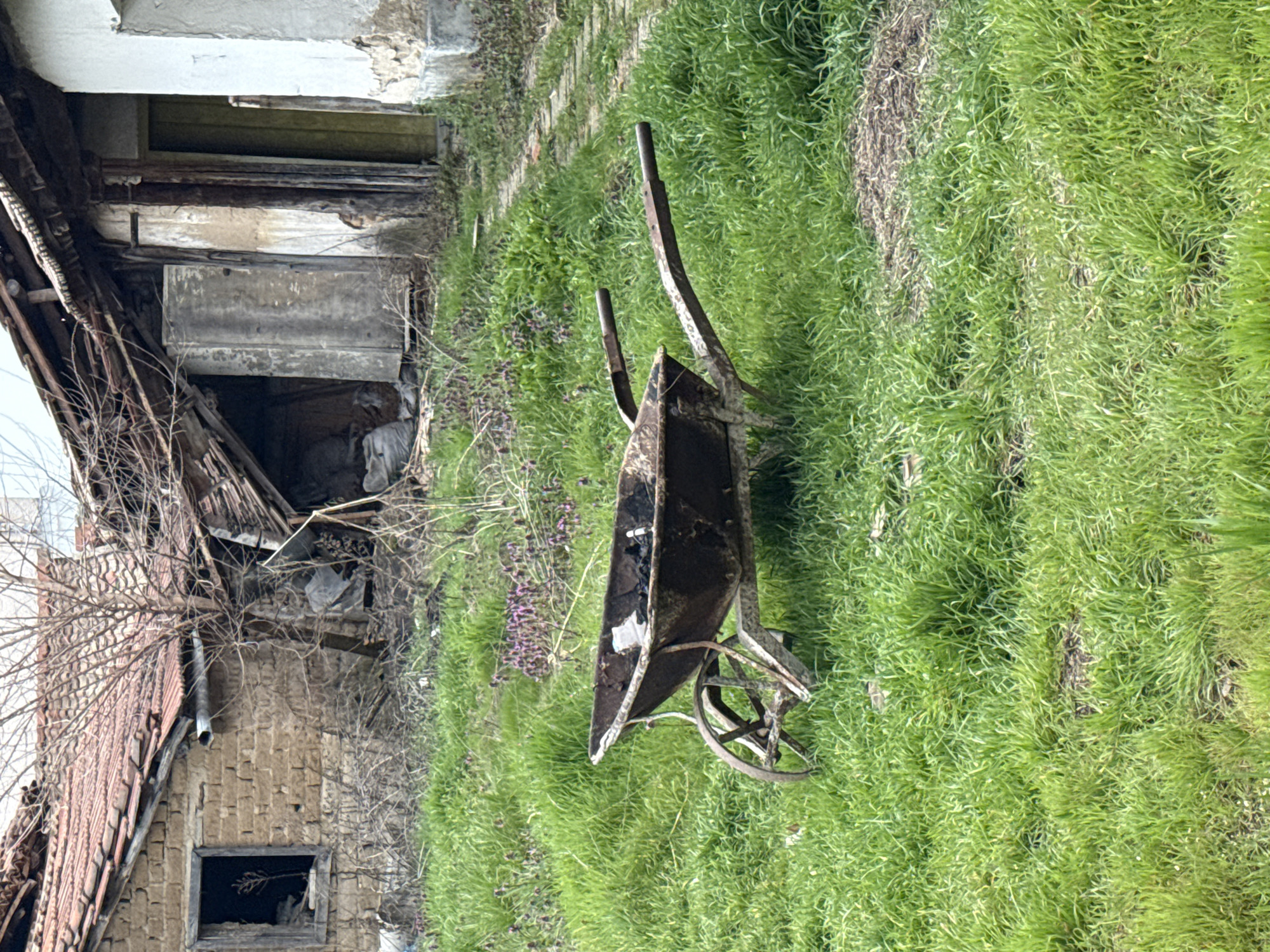 The image depicts a derelict building in Staro Zhelezare, Bulgaria. The building shows significant signs of disrepair, with a collapsed section of the roof, decaying walls, and a window devoid of glass. A rusted, antiquated wheelbarrow sits on the overgrown grass to the right of the building. The vegetation suggests a spring or early summer setting. There are no people visible.