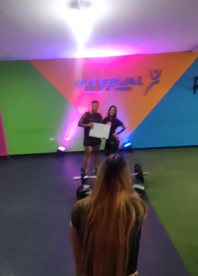 A video shows a gym interior. In the foreground, a long-haired woman films with a phone. In the background, a man and woman pose holding a document in front of a colorful wall with the word "INTERVAL" written on it. A barbell and kettlebells are on the floor in front of them. Another young woman enters the shot from the right.