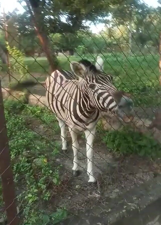 zebra standing in its enclosure. It is a sunny day and there is green vegetation in the background. The zebra is behind a chain-link fence. A person's hand appears briefly in the frame. The zebra is mostly facing away from the camera.