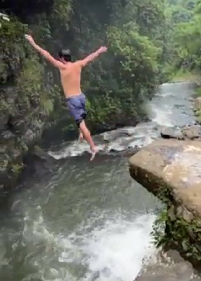 man jumping off a rocky ledge into a fast-moving river surrounded by lush greenery. The man, shirtless and wearing dark shorts, leaps into the air with his arms outstretched. The river below appears turbulent with white water rapids. The surrounding environment is a dense, green forest, with trees and vegetation covering the rocky cliffs alongside the river. The camera follows the man’s jump, then focuses on the river as he enters the water. A second person is visible in the top right corner of the frame at the start, appearing to be filming the jump.