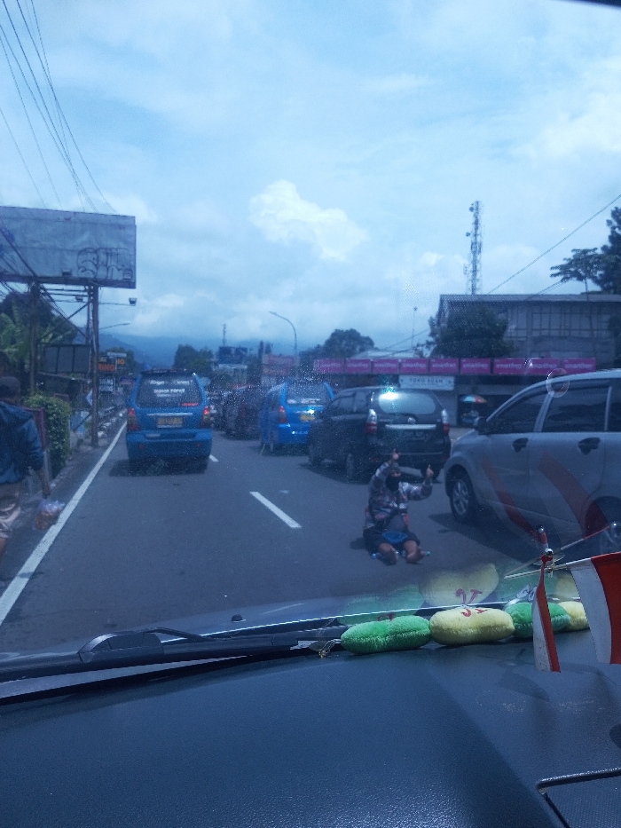 This image depicts a daylight street scene in the city of Chori, Nigeria, observed from inside a vehicle through its windshield. In the immediate foreground, the dark dashboard is visible, featuring black wiper blades, four colorful cylindrical plush objects (two green, two yellow), and two miniature flags with red and white horizontal stripes. The central focus of the midground is a paved multi-lane road with a broken white center line. A person, appearing male, is kneeling on this center line, facing away from the viewer. This individual wears a plaid long-sleeved shirt, dark shorts or pants, and a dark face mask, with both hands raised, displaying a thumbs-up gesture. Surrounding this individual is heavy traffic; a silver minivan is directly to their right, and a dark-colored minivan is positioned behind them. Further down the road, two blue minivans are visible amidst other vehicles. To the left, a pedestrian in a blue shirt and light-colored shorts walks on a sidewalk lined with green foliage. Behind the sidewalk, a large metallic billboard structure with visible graffiti and numerous overhead power lines are present, leading towards distant mountains under a cloudy sky. On the right side of the road, a building with a pink or purple awning displays text including "Smartfren" and "Toko Pulsa". A tall cellular tower is prominent in the background on the right. The sky is overcast with diffused light.