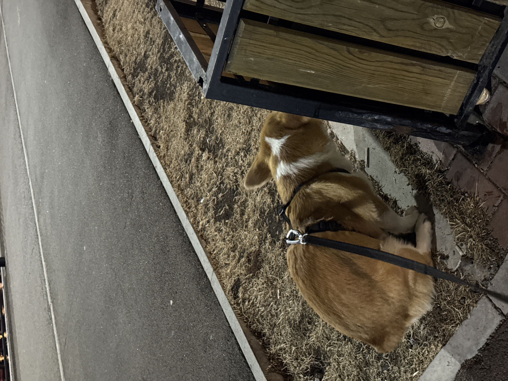 A medium-sized corgi dog wearing a black harness lies on a bed of dry grass and dirt next to a sidewalk and road