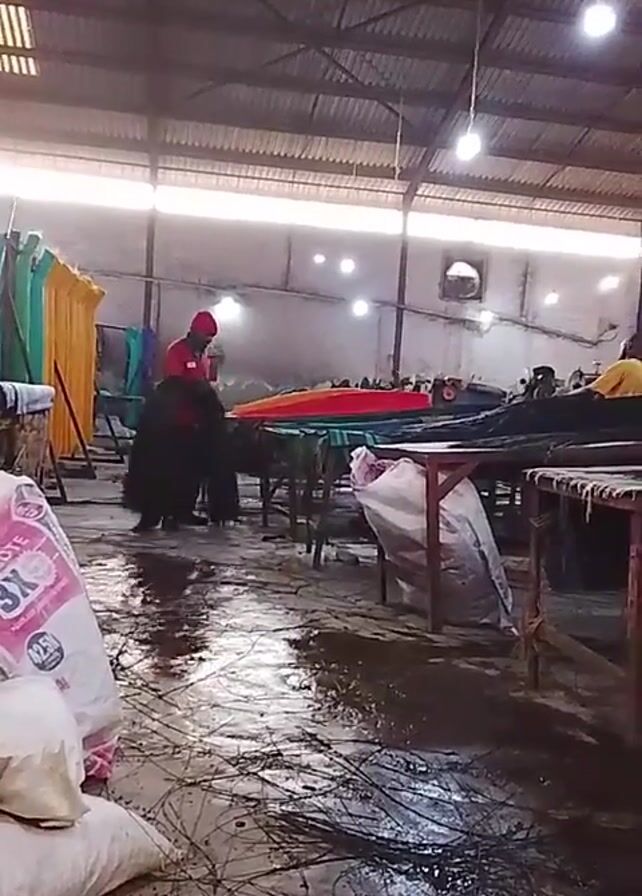 interior of a large, somewhat dilapidated warehouse or factory space. The ceiling is high with exposed metal beams and overhead lighting. A few workers are present, one wearing a red shirt and hat is shown near the center, handling some kind of dark, possibly woven material. Another worker in a yellow shirt is visible in the background. In the foreground, there are large white bags, wires scattered on a wet, dirty floor, and various tables with what appear to be colorful fabric or material on them. The floor looks like it is partially flooded or covered in liquid. The overall atmosphere suggests an industrial setting where manual labor is performed.
