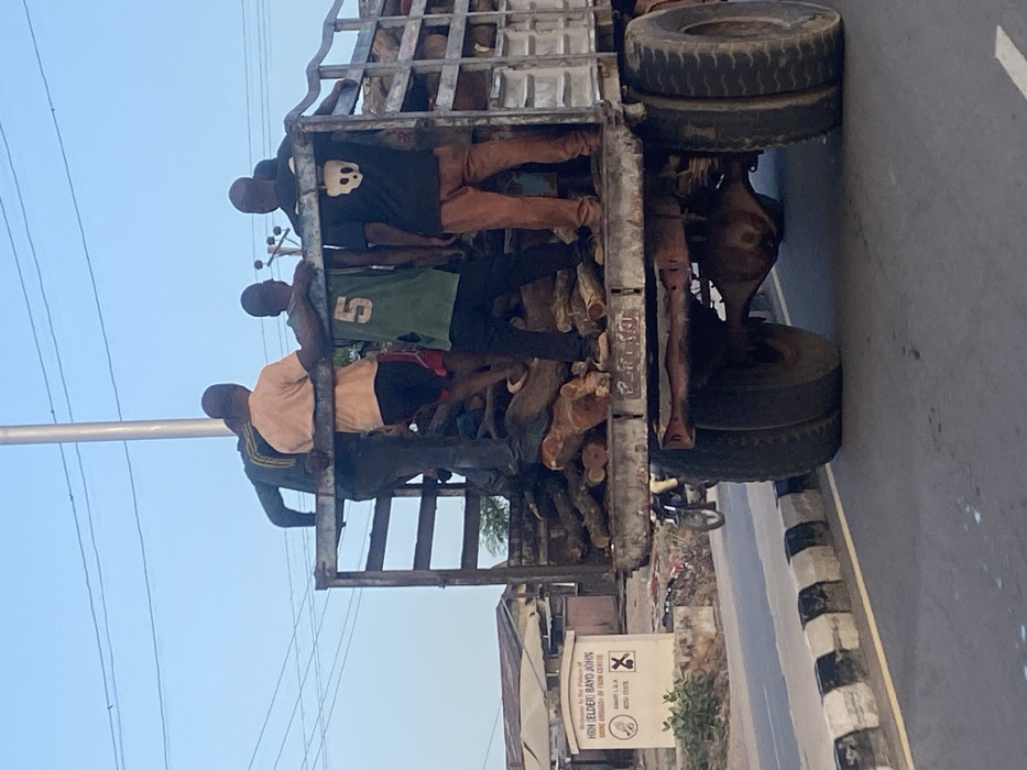 A rear-view perspective of a grey, open-bed cargo truck traveling on a paved road in Zango-ndaji, Kogi State, Nigeria