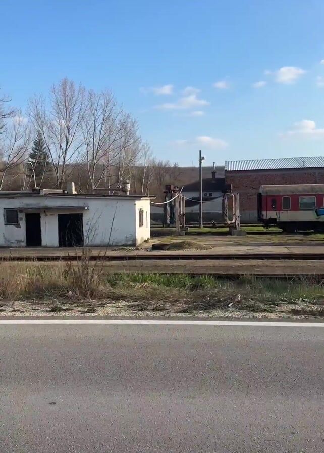 The camera travels along a paved road, passing a defunct railway station on the right. The sky is blue with scattered clouds. The first building is small and white, followed by some disused train carriages and a brick building. Next is a larger, run-down white building with a row of windows. A tall chimney is visible behind the buildings. Bare trees dot the landscape.