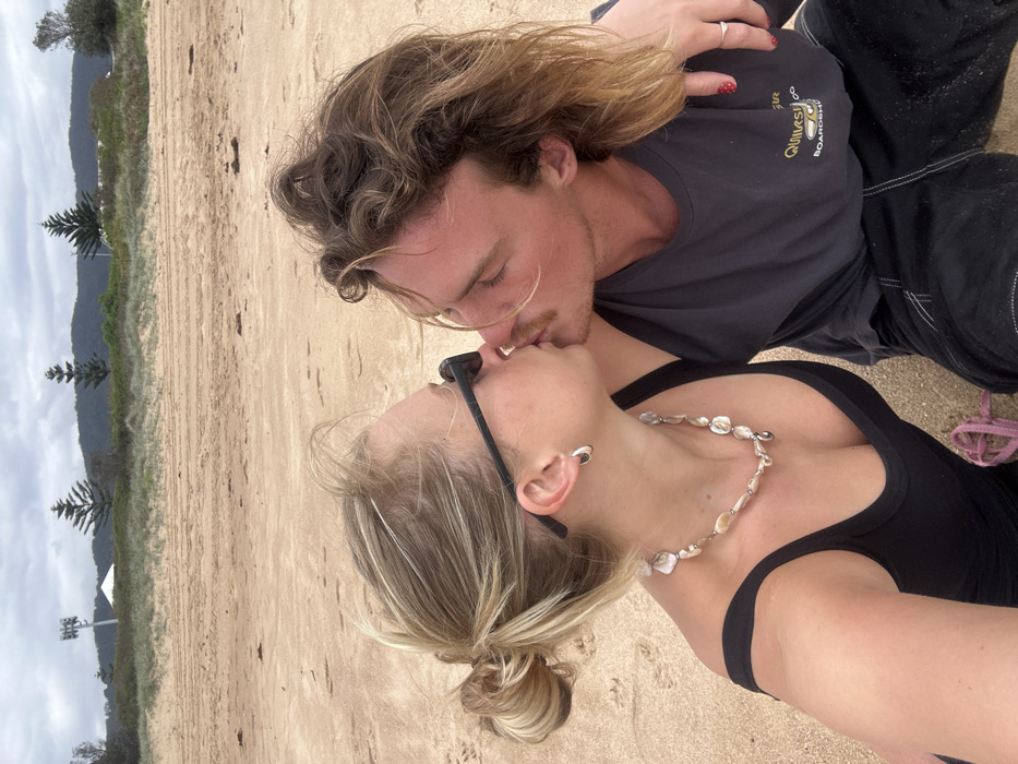 On a sandy beach, a couple is kissing. The woman, with blonde hair pulled back, wears sunglasses, a black tank top, and a seashell necklace. The man has long, wavy brown hair and is wearing a dark gray t-shirt. They are situated on the sand, with a backdrop of green trees and a cloudy sky. The horizon is slightly obscured. The overall tone is intimate and affectionate.