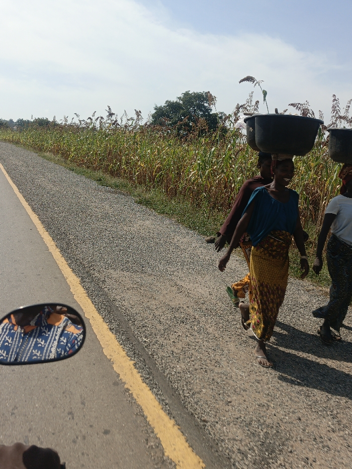 The scene depicts a rural roadside in Alizaga, Nigeria, under a daylight sky with scattered white clouds. A paved road, marked by a solid yellow line on its left edge, runs parallel to a gravel shoulder. Beyond the gravel path, a dense field of tall, mature crops, consistent with corn or sorghum, extends into the background, where a large green tree is visible. Three adult females are walking in single file from right to left along the gravel shoulder. Each woman carries a dark, round basin balanced on her head. The lead woman, positioned centrally, wears a blue short-sleeved top and a patterned yellow and brown ankle-length skirt, displaying an arm bracelet. She is smiling and appears to be barefoot or wearing minimal footwear. The second woman, slightly behind, is partially obscured but wears a dark, possibly maroon, garment. The third woman, trailing, wears a light-colored top and dark patterned trousers. The image is captured from a low angle, likely from a vehicle or motorcycle, evidenced by the reflection of a person's torso wearing a blue and white patterned shirt in a side-mirror located in the bottom-left corner.