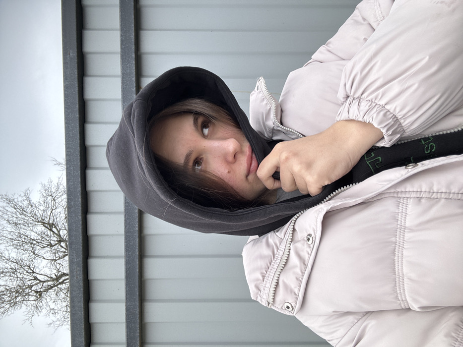 A young female is depicted in a chest-up, eye-level outdoor portrait. She has long, dark brown hair and brown eyes, looking towards the upper left of the frame with a neutral expression. She is wearing a dark grey hooded sweatshirt with the hood up, covering her head, layered beneath a light beige or pale pink puffy winter jacket. Her left hand is raised, gripping the collar of the hooded sweatshirt near her chin, partially obscuring her mouth. The background consists of a light grey corrugated metal fence, likely serving as a boundary wall. Above the fence and to the upper left, the bare branches of a leafless tree are visible against an overcast, uniformly grey sky. No specific identifying landmarks within the image confirm the location as Slavyansk-na-Kubani, Russia. The attire and lack of foliage on the tree indicate cool or cold weather conditions.