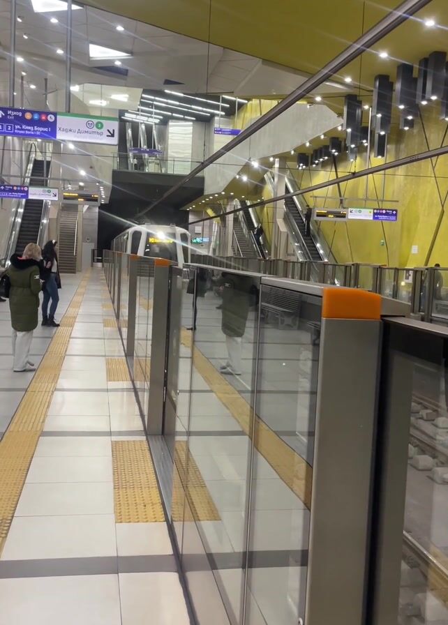 metro train arriving at a station. The platform is clean and modern with glass barriers separating the passengers from the tracks. Several people are waiting on the platform. The train is white with blue accents and the destination "M3 Хаджи Димитър" is displayed on the front. Escalators and stairs lead to upper levels of the station. The walls are decorated in a modern geometric pattern with yellow as a primary color.
