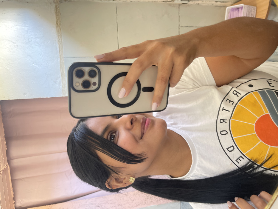 A female subject is depicted in a mirror selfie, captured in an interior room. She has dark hair styled in a low ponytail with bangs, and is wearing a white t-shirt with a partial circular graphic design featuring a sun and mountains, with reversed text that reads "RETRO DE". A gold-colored, four-leaf clover-shaped earring is visible in her left ear. Her fingernails are painted a light pink or nude shade. She holds a light-colored smartphone, likely an iPhone, encased in a clear or translucent MagSafe-compatible case with a visible black circular magnet, reflecting the phone's rear cameras. The background consists of a light-colored, textured wall, possibly painted concrete or tile, showing some wear. A pink fabric or curtain is visible on the left. To the right of the subject, a small, clear container filled with purple packaged feminine hygiene products is present. The environment suggests a private indoor setting, such as a bathroom or bedroom, within the city of Unknown, Unknown.