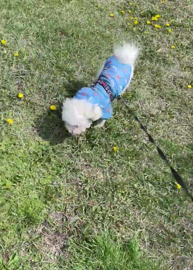 A small, fluffy, white dog wearing a blue patterned jacket with a red and black harness walks on a green lawn dotted with yellow dandelions. The dog is on a black leash, held by a person whose hand and part of a pink leash handle are visible. The dog sniffs the ground near a brown metal pipe or pole laying on the grass. A small, green bush is visible in the background. The day appears sunny.
