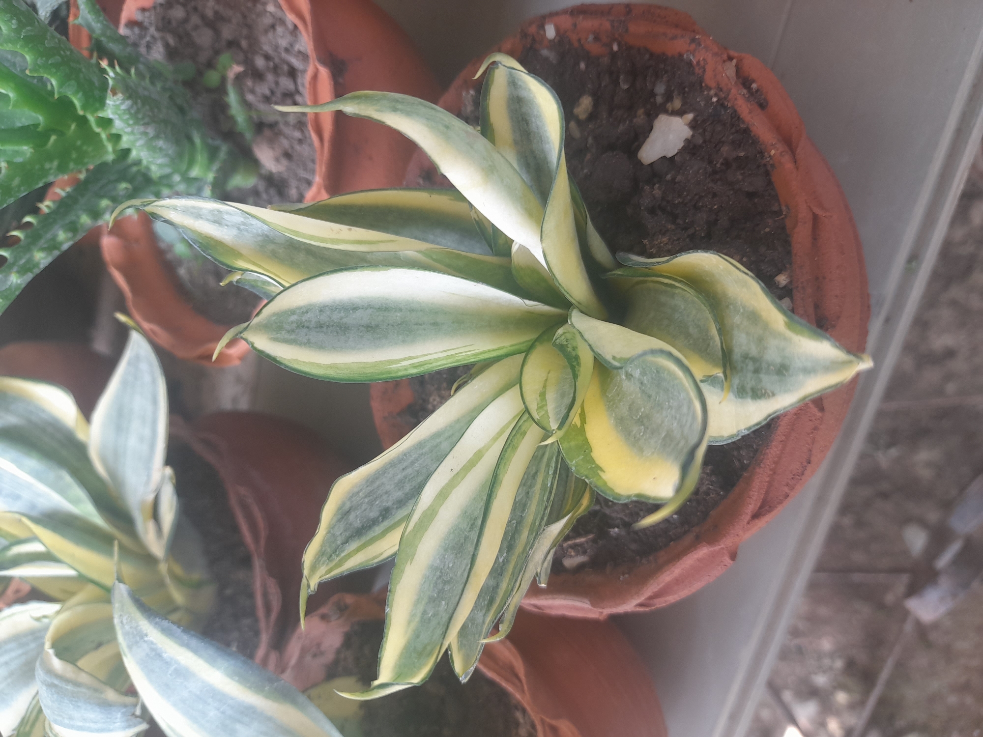 A close-up, high-angle shot shows several potted plants. The primary subject is a snake plant (Sansevieria trifasciata 'Golden Hahnii') in a reddish-brown terracotta pot. The plant has variegated leaves with white, green, and yellow stripes. The soil in the pot is dark brown and appears slightly dry, with a small white object visible on the surface. Partially visible in the background are other potted plants, including one with spiky, green succulent leaves, which appear to be an Aloe. The scene is located in Tinaquillo, Venezuela.