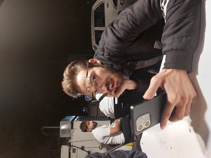 This image depicts a nighttime scene in the city of Sarouja Municipality, Syria. The primary subject is a male, approximately 25-35 years old, positioned in the foreground. He has light brown hair, styled backward, and a trimmed beard. He is wearing a black quilted jacket, which features an "Adidas SPORT" logo on the right chest area and three white stripes on the left cuff, over a grey long-sleeved shirt. Rectangular wire-frame glasses are perched on his forehead. He holds a black smartphone, equipped with a dual-lens camera system, horizontally in his left hand. His right hand supports his chin, with his elbow resting on a white table. His mouth is slightly open, and he is looking directly at the camera. In the mid-ground, to the left and slightly behind the primary subject, another male individual with dark hair and a beard is visible, wearing a white t-shirt. He is seated and oriented to his left, away from the camera. A third individual, wearing a white shirt, is partially visible behind the primary subject's head. The background is dark, indicating nighttime, with artificial light sources illuminating the immediate area. To the far left, a large, light-colored industrial-style unit with a vertical pipe extending upwards is present. To the right, a light-colored sedan vehicle is partially discernible. The scene suggests an informal outdoor or semi-outdoor gathering, possibly at a cafe or similar establishment.