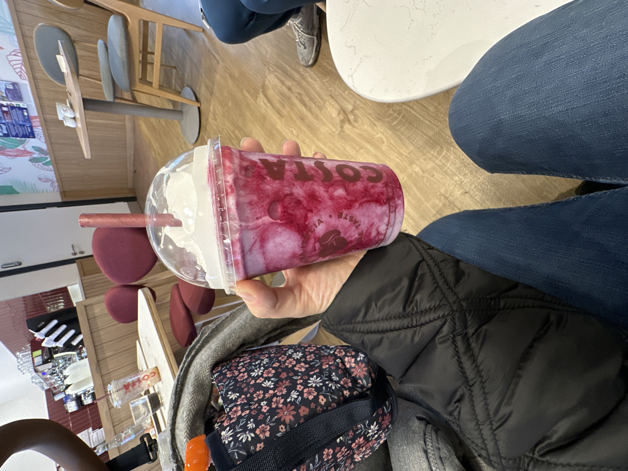 The image depicts the interior of a Costa Coffee establishment located in Macclesfield, United Kingdom. The scene is viewed from a first-person perspective, looking down and forward. In the foreground, a human hand holds a clear plastic cup containing a layered pink and white beverage, topped with whipped cream and a pink straw. The cup displays the "COSTA" logo vertically. The individual holding the cup is wearing blue denim jeans and a black quilted jacket. To the left of the holder, a dark floral-patterned bag with a black strap is visible, resting on a grey fabric surface, with an orange cap near its top. A white circular table is partially visible to the right. The background shows a brightly lit cafe environment with light wooden floorboards. On the left side, a coffee preparation area features a large chrome espresso machine, multiple white milk pitchers, and a dark red tiled backsplash. In front of this counter, a light-colored wooden table with a white top holds an empty clear plastic Costa cup, a glass with dark liquid, and a plastic bottle. Two round, dark red upholstered stools are positioned at this table. The right side of the background shows a small, light grey rectangular table with a central pedestal base, topped with two small white containers. Two light grey upholstered chairs with wooden frames are situated at this table. The lower sections of the walls feature light wood paneling, while the upper right wall displays abstract, colorful botanical-themed wallpaper. In the far right background, the lower legs and feet of another individual, wearing blue trousers and grey sneakers, are visible.