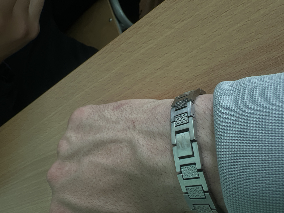 A close-up image depicts a person's left forearm and wrist, extending from a light grey, ribbed fabric sleeve. The skin exhibits visible veins and fine hair. A metallic, possibly brushed stainless steel, link bracelet is worn on the wrist. The bracelet features multiple rectangular links, some with a textured, crosshatch pattern, and a central link bearing a subtle, embossed logo. The arm rests on a light-colored wooden surface, likely a desk or table, exhibiting a consistent wood grain running diagonally from the upper left. The background on the right is dark and out of focus, with a partial view of a metallic object, possibly a chair component, suggesting an indoor environment. The specific location within Kardzhali, Bulgaria, is not discernible from the provided visual information.