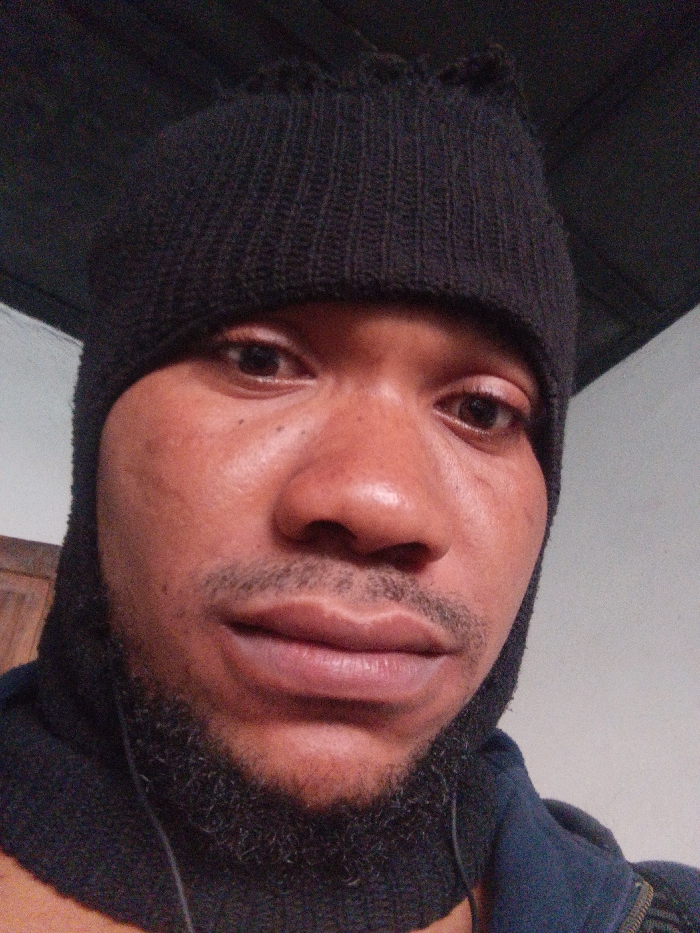 A close-up, head-and-shoulders portrait depicts an adult male with dark skin, brown eyes, and short, dark facial hair including a beard and mustache. He is wearing a black knitted balaclava or beanie that covers his head, ears, and neck, pulled up to reveal his face. A dark blue collared garment, possibly a jacket or hoodie, is visible around his neck and chest. A black earphone wire extends from beneath the balaclava on the right side of his neck. The subject is looking directly into the camera with a neutral expression. The background consists of a plain light-colored wall or surface, with a darker section visible in the upper right. A partial view of a wooden surface, possibly a door frame, is visible on the left side of the frame. The specific location within the city of Alaiyabiagba, Nigeria, is not discernible from the visual information provided.