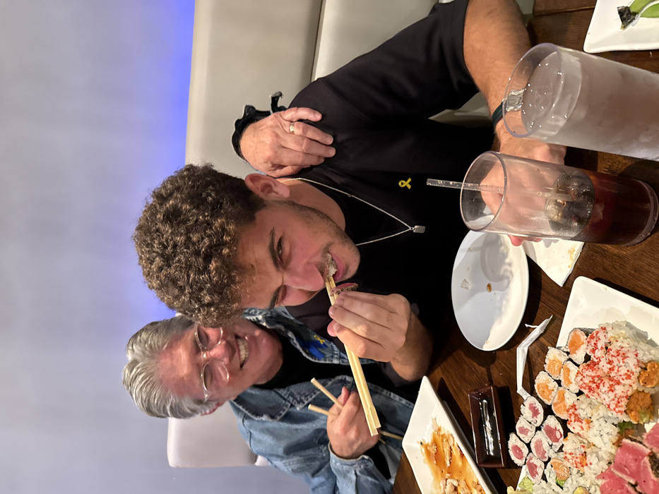 An indoor photograph, taken in a restaurant in West Windsor, United States, depicts two individuals seated at a wooden table during a meal. In the foreground, a younger adult male with curly brown hair, wearing a black t-shirt with a yellow ribbon pin and a silver necklace, consumes food. He holds a piece of sushi with wooden chopsticks to his open mouth, displaying a squinted expression and visible orthodontic brackets on his upper teeth. His left arm is bent, holding the chopsticks, while his right arm is largely obscured. To his left, partially behind him, an older adult with silver hair and glasses wears a blue denim jacket over a dark shirt, also featuring a yellow ribbon pin. This individual smiles broadly, holding a pair of chopsticks in their left hand, with their right hand resting on the younger adult's left shoulder. The wooden table is laden with multiple white rectangular plates showcasing various sushi rolls, including tuna, salmon, and red roe toppings. Another rectangular plate contains a sauced protein dish. A small black dish holds dark liquid (soy sauce). Two clear plastic tumblers containing beverages are present: one with a dark carbonated drink and a straw, and another with a lighter, possibly iced, liquid. An empty white plate and crumpled white napkins are also visible. The background consists of light-colored booth seating and a wall illuminated with a soft blue ambient light.