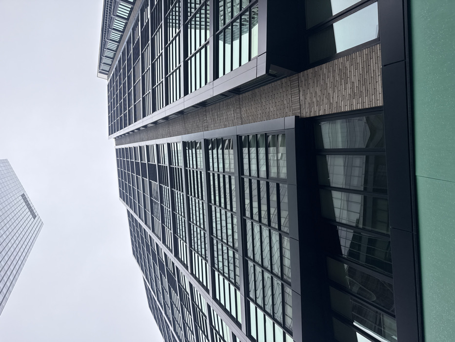 An upward-looking photograph captures a section of Watermark Seaport (85 Seaport Boulevard) in Boston's Seaport District, Massachusetts, United States