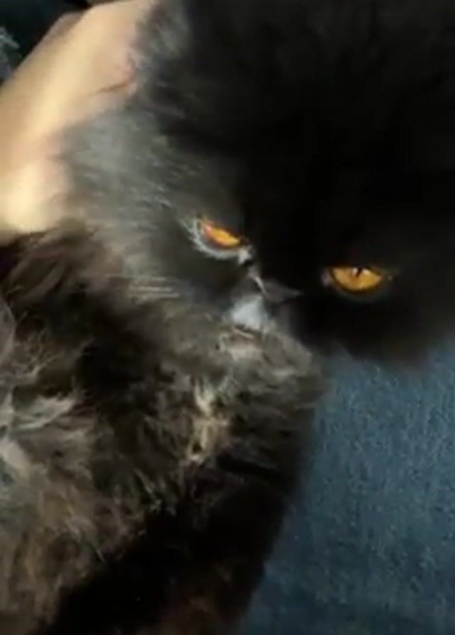 A person pets a black Persian cat with amber eyes. The cat is lying on the person's lap, which is covered in denim. The person's hand is visible stroking the cat's head and neck. A voice in the background is audible.