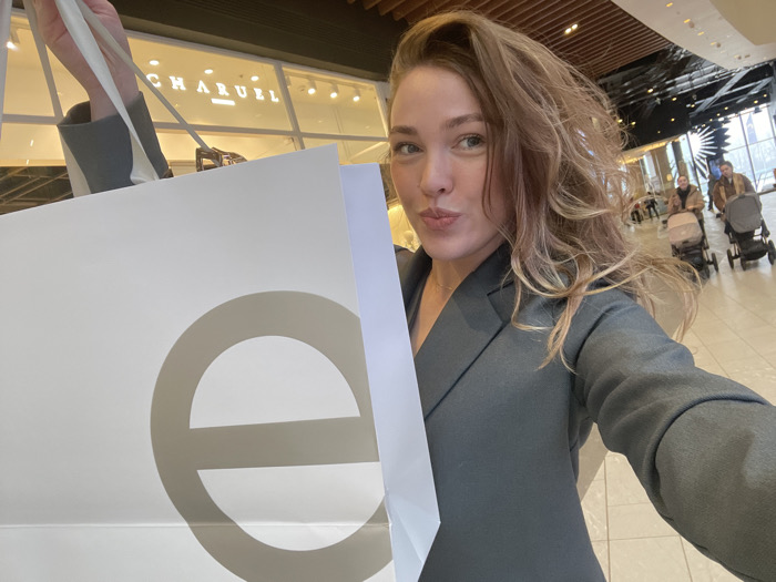 An eye-level indoor selfie captures a woman in a modern shopping mall or commercial complex in Kommunarka, Russia. The woman, positioned in the foreground, has wavy light brown hair and is wearing a dark grey blazer-style jacket. She is looking directly at the camera with her lips pursed in a "kissing" expression. Her left hand holds the white straps of a large white shopping bag that features a prominent grey curved design resembling the letter "e" on its front, partially obscuring the left side of her body. In the mid-ground, a store facade labeled "CHARUEL" is brightly illuminated. Further in the background, on a reflective tiled floor, two individuals are visible pushing baby strollers; one stroller is light pink/beige, and the other is grey. The environment features contemporary interior architecture with complex ceiling designs and artificial lighting.