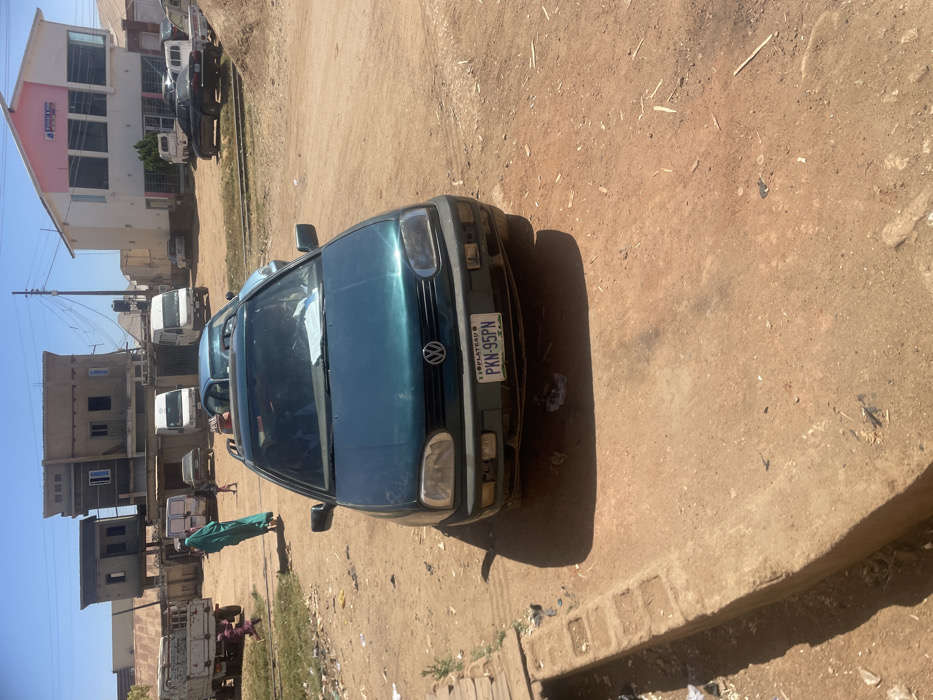 The scene depicts a sunny outdoor area in Bukuru, Nigeria, characterized by unpaved, reddish-brown dirt roads and numerous buildings. In the immediate foreground, a dark green Volkswagen Golf 3 hatchback is parked, facing the camera. Its front license plate displays "PLATEAU PKN-95PN." Papers are visible on the dashboard. The lower left side of the front bumper appears partially detached. To the immediate left of the car, a concrete curb runs parallel to the foreground, with visible debris and refuse in the gutter alongside it. In the midground, behind the Volkswagen, another light-colored car is partially visible. Further back on the left, a white flatbed pickup truck is parked. A person wearing a long, flowing teal garment walks away from the camera towards the left. Two children are also present on the left: one in a reddish garment runs near the white truck, and another smaller child stands closer to the person in teal. Behind these individuals, several buildings are visible, including a two-story light brown structure and multiple white vans parked in a lot. On the right side of the midground, a prominent two-story building features a white and pink facade with a sign on its upper level. Further right, a dark sedan and a white pickup truck are parked on another unpaved area. Utility poles and overhead power lines extend across the clear blue sky in the background. The ground throughout the scene is dusty and unpaved, with scattered refuse in various locations. Strong shadows are cast, indicating clear, bright sunlight.