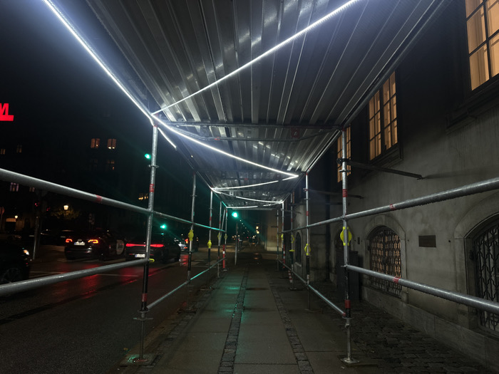 The image depicts a nighttime urban scene in Copenhagen, Denmark, specifically along Frue Plads, adjacent to the main building of the University of Copenhagen. A prominent temporary scaffolding tunnel, constructed from silver-colored metal poles and corrugated metal roofing, covers a pedestrian walkway in the foreground and midground. The underside of the scaffolding is illuminated by multiple bright white LED strip lights, tracing diagonal and horizontal paths, creating a well-lit passageway. Yellow safety attachments are visible on some vertical support poles. The pedestrian path within the tunnel is paved, transitioning from cobblestones closer to the building on the right to smoother, darker paving slabs further left. To the right of the pedestrian tunnel stands a multi-story, historic-style building, confirmed as the University of Copenhagen's main building. Its facade is composed of light grey stone or concrete. Several windows, deeply recessed with multi-pane wooden frames, are visible on the upper floors, emanating a warm, yellow-orange light. At street level, below some windows, are arched openings fitted with decorative metal grates. A small, unreadable rectangular plaque is affixed to the wall between two ground-level window sections. To the left of the scaffolding tunnel, a wet, dark asphalt street is visible, reflecting the ambient light. Several vehicles are present, indicated by their illuminated red taillights, suggesting traffic is either stopped or moving slowly. A green traffic light is clearly visible at mid-distance, with another green light further down the street. In the upper-left quadrant, across the street, a large, prominent red 'M' sign, likely neon or LED, is brightly lit, partially obscuring a background building with dimly lit windows. No individuals are visible in the scene.