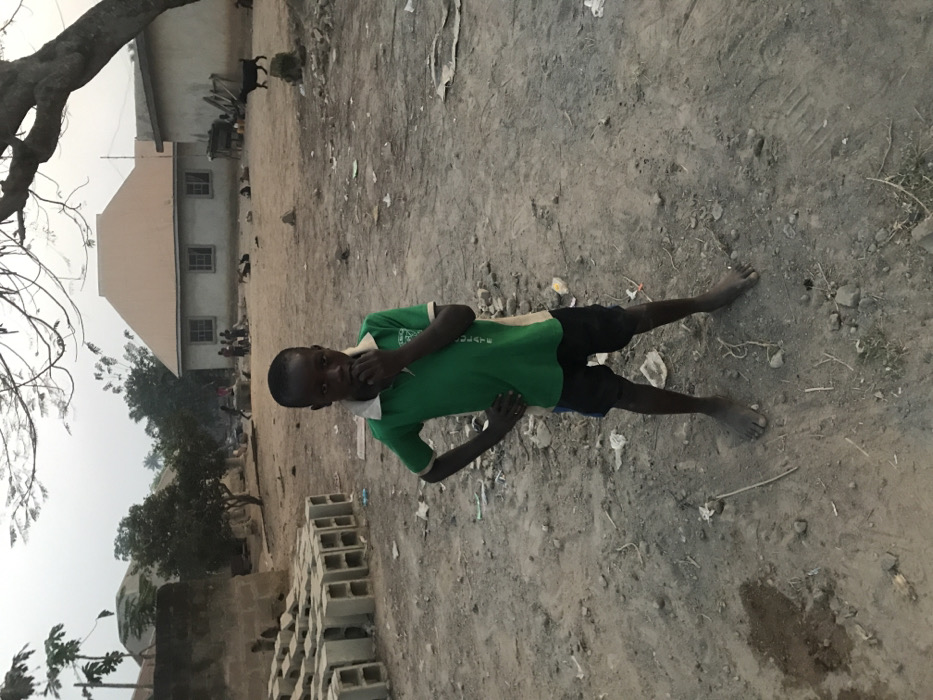 A young, barefooted boy in a green shirt and black shorts stands on dirt ground, holding his chin with his right hand. A stack of concrete blocks sits to his left. In the background, a light-colored building with windows and a sloped roof is visible, along with trees and what appear to be other people. A large bare tree branch frames the upper left corner of the image. Debris is scattered on the ground.