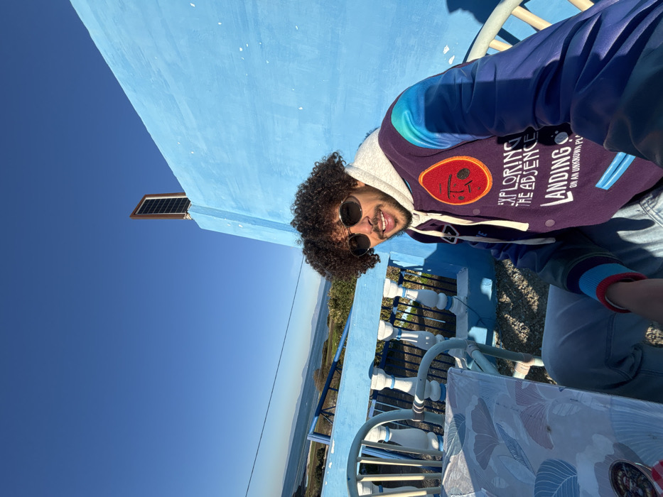 - "A person with curly hair and sunglasses sits at a blue table, likely on a rooftop or balcony, overlooking a coastal landscape with a clear blue sky" by FM-YEyMx1, licensed under CC BY 4.0