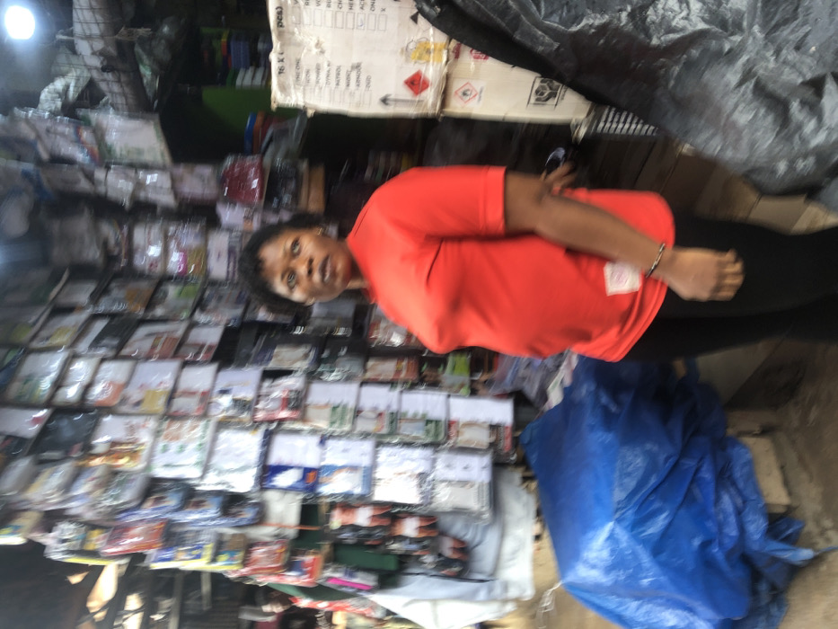 An adult female stands slightly right of the center in what appears to be an outdoor market stall in Fegge, Nigeria