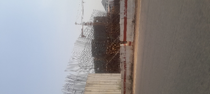 This image captures a large-scale construction site in Abuja, Nigeria, observed from an adjacent roadway. The foreground features an asphalt road surface. Immediately beyond the road, a series of light grey concrete barriers, each with a distinctive horizontal red stripe across its upper segment, delineates the construction perimeter. A notable gap exists between two central barriers, suggesting an entrance or exit point to the site. Behind the barriers, the primary elements of a building under construction are visible. On the far left, a tall, unadorned concrete wall stands vertically. Adjacent to it, a dense array of vertical steel reinforcing bars (rebar) extends upwards, indicating a structural framework. Towards the center and right, a significant portion of the building's core is under development, characterized by an intricate lattice of rebar, scaffolding, and visible wooden formwork used for concrete pouring. A prominent yellow tower crane is positioned above this central construction activity. In the far background, behind the active construction, a multi-story white building with a dark, sloped roof is partially discernible. The sky above is clear and light blue, indicative of daytime conditions. No individuals are visible within the frame.