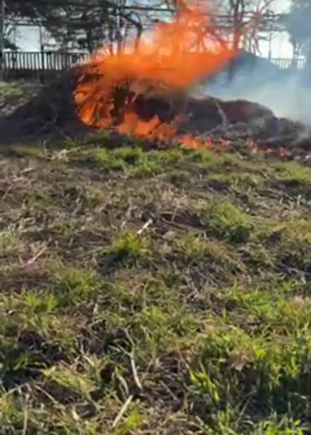 A pile of burning yard waste sends flames and smoke billowing upwards against a backdrop of trees, a fence, and a clear blue sky