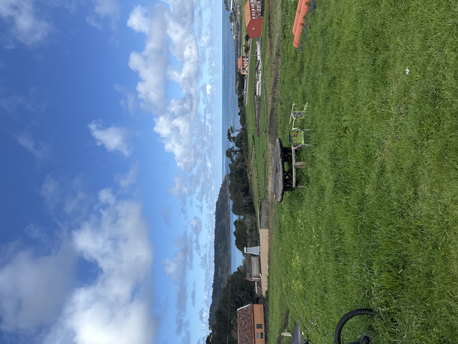 The image displays an elevated view of the Muxía, Spain coastline under a partly cloudy blue sky. The foreground consists of vibrant green grass, featuring a partial black bicycle wheel on the far left. Slightly right of center, a rustic, round wooden picnic table with an attached bench is present. To its right are two dilapidated metal chairs, one painted green. On the far right, three orange pipes are stacked horizontally on the grass. In the midground, a cluster of buildings is visible, including an orange-roofed house on the left and a small light-colored building with a white, multi-faceted roof structure behind it. A dark paved road borders the orange house. Beyond these structures, a dense line of green trees and shrubs separates the land from the ocean. The background reveals the blue Atlantic Ocean, characterized by whitecaps, and a forested landmass forming a bay on the left. Distant red-roofed buildings are visible along the far shoreline to the right. No people or overt actions are depicted.