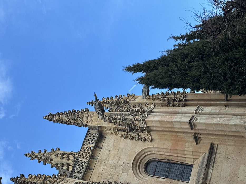 The image captures a low-angle view of the exterior wall of a historic building, located in Segovia, Spain, at coordinates 40.95 latitude and -4.124 longitude. The building, constructed from beige stone, features intricate, sculpted details that adorn its facade, including decorative spires and gargoyles. A large window with a black metal grate is situated in the lower right corner of the wall. The building's upper section extends into the frame, showcasing the intricately carved details. In the background, a portion of a lush green tree is visible, with a blue sky above. The image features a faint white contrail from an aircraft streaking across the sky. The building is likely a church or cathedral, a notable landmark in the city of Segovia.