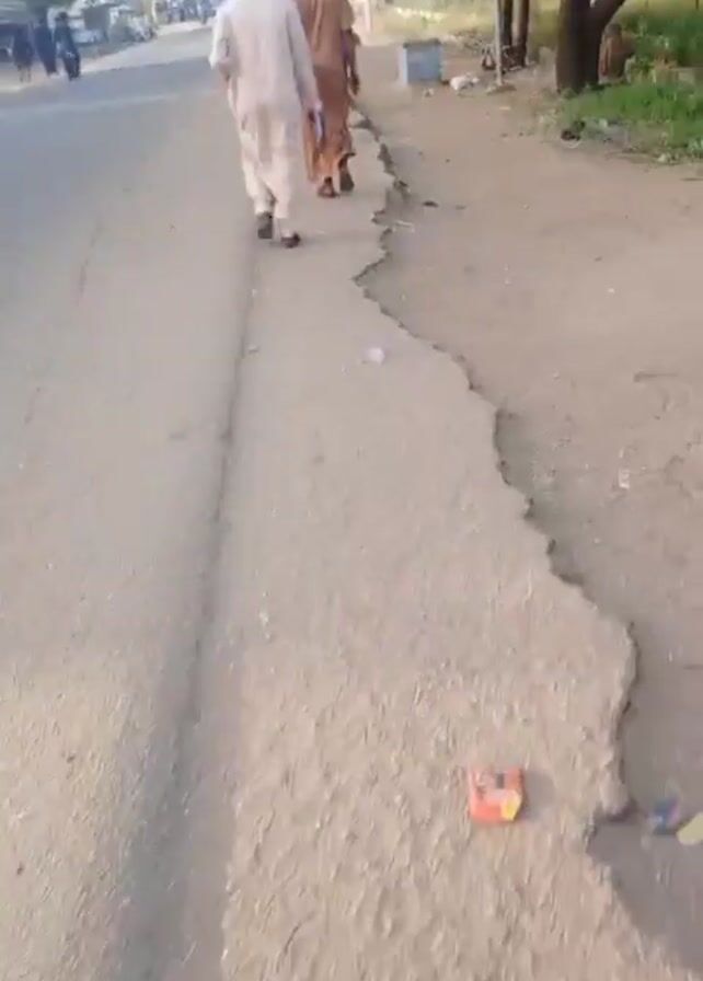 two men walking along a paved road in a rural or suburban environment. Both men are wearing traditional robes. The man on the left wears a white robe and a dark hat. The man on the right wears a tan robe. The road has a strip of damaged pavement along its edge. There are trees and low buildings on either side of the road. People are seen gathering near the buildings in the distance. A motorcycle passes by in the first few seconds of the video. The camera is moving, following the two men as they walk.